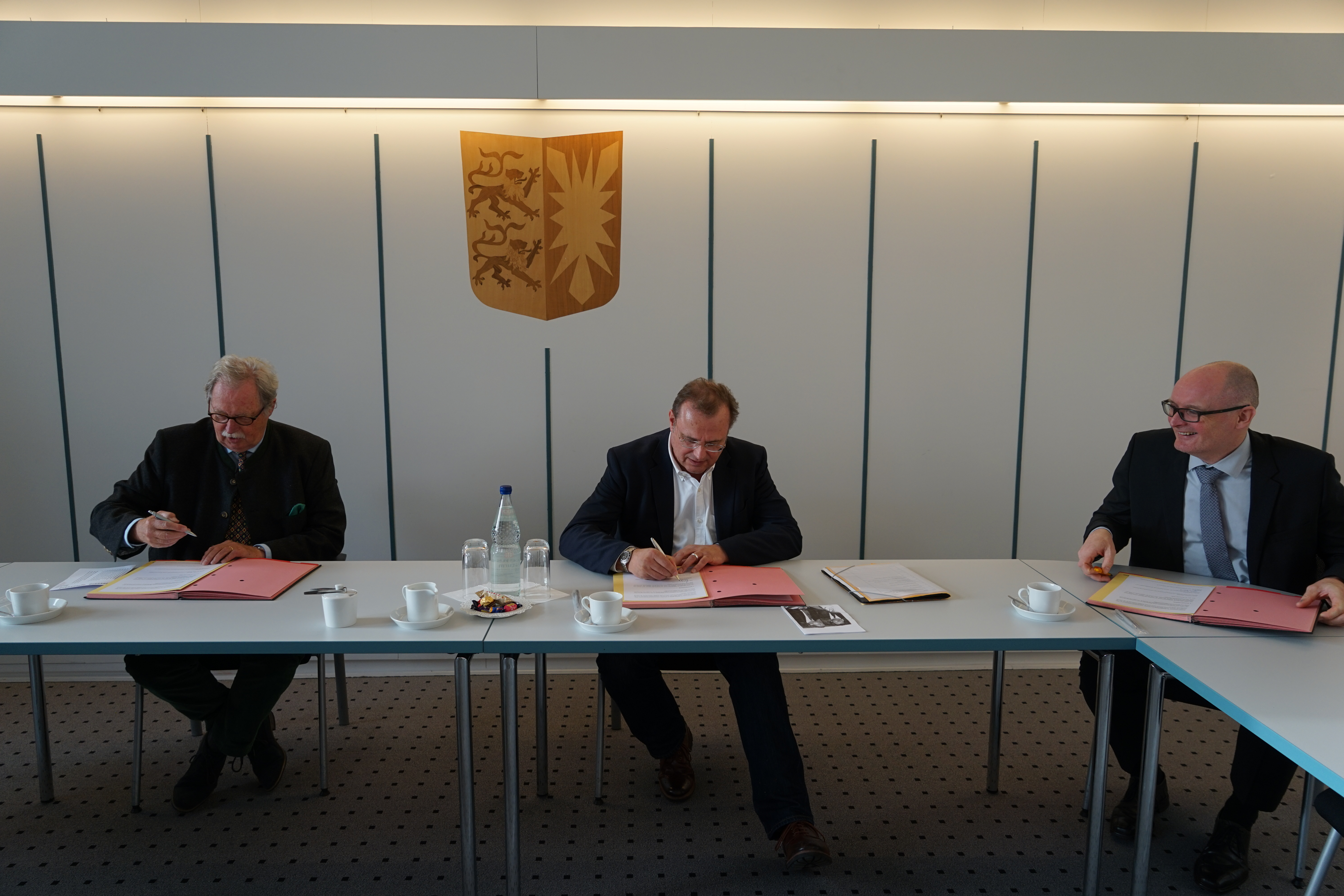 Claus Christian Claussen, Justizminister in Schleswig-Holstein sowie Jochem Schlotmann, Verwaltungsratsvorsitzender der VZSH und VZSH-Vorstand Stefan Bock sitzen an einem Konferenztisch und unterzeichnen eine Vereinbarung.