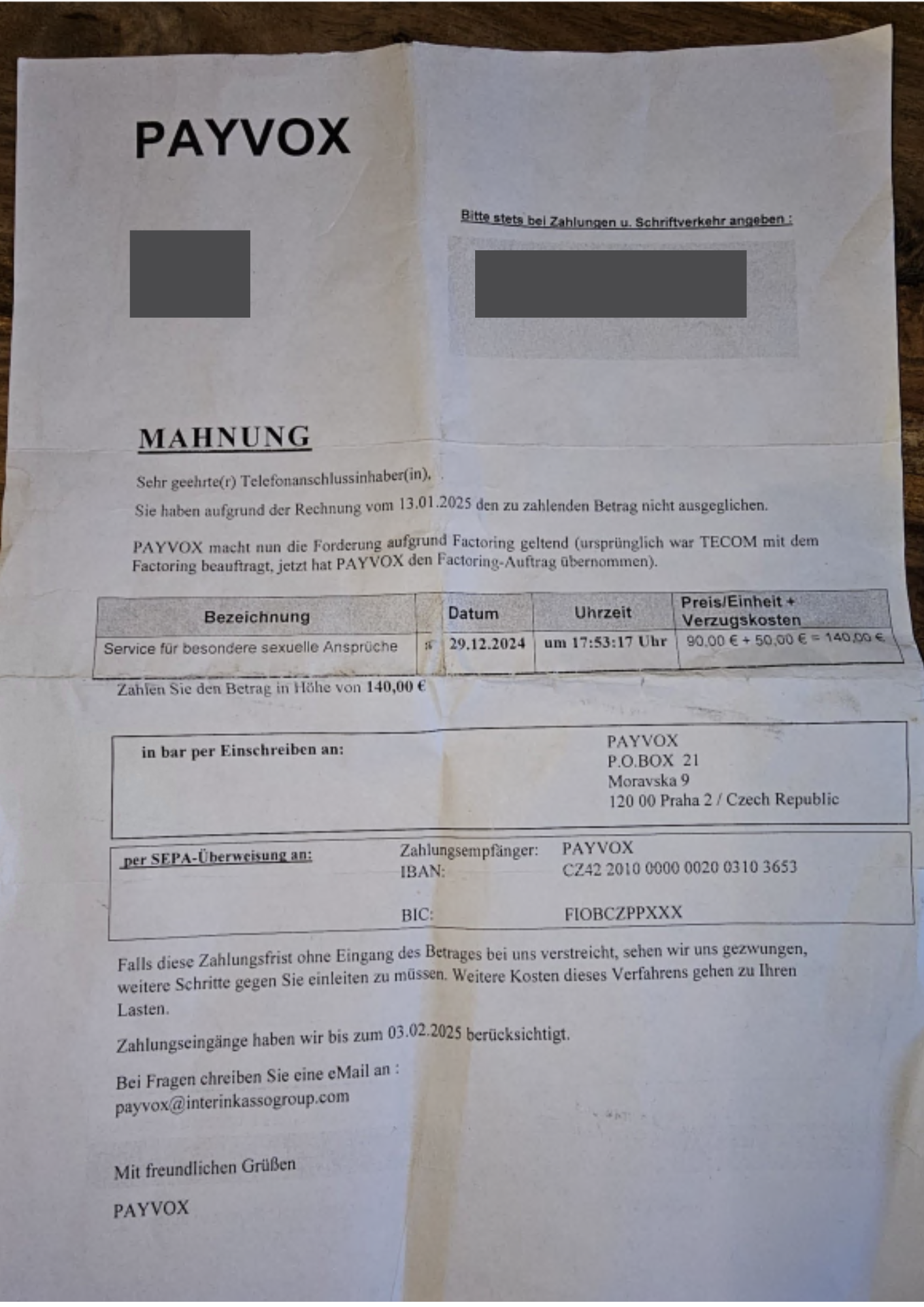 Verschickt werden die Rechnungen und Mahnungen oft per Post, ebenso per SMS oder WhatsApp. Die Forderungen wirken auf den ersten Blick meist seriös: Angegeben sind Telefonnummer, Datum und Uhrzeit des angeblichen Anrufs bei der Telefonsex-Hotline.