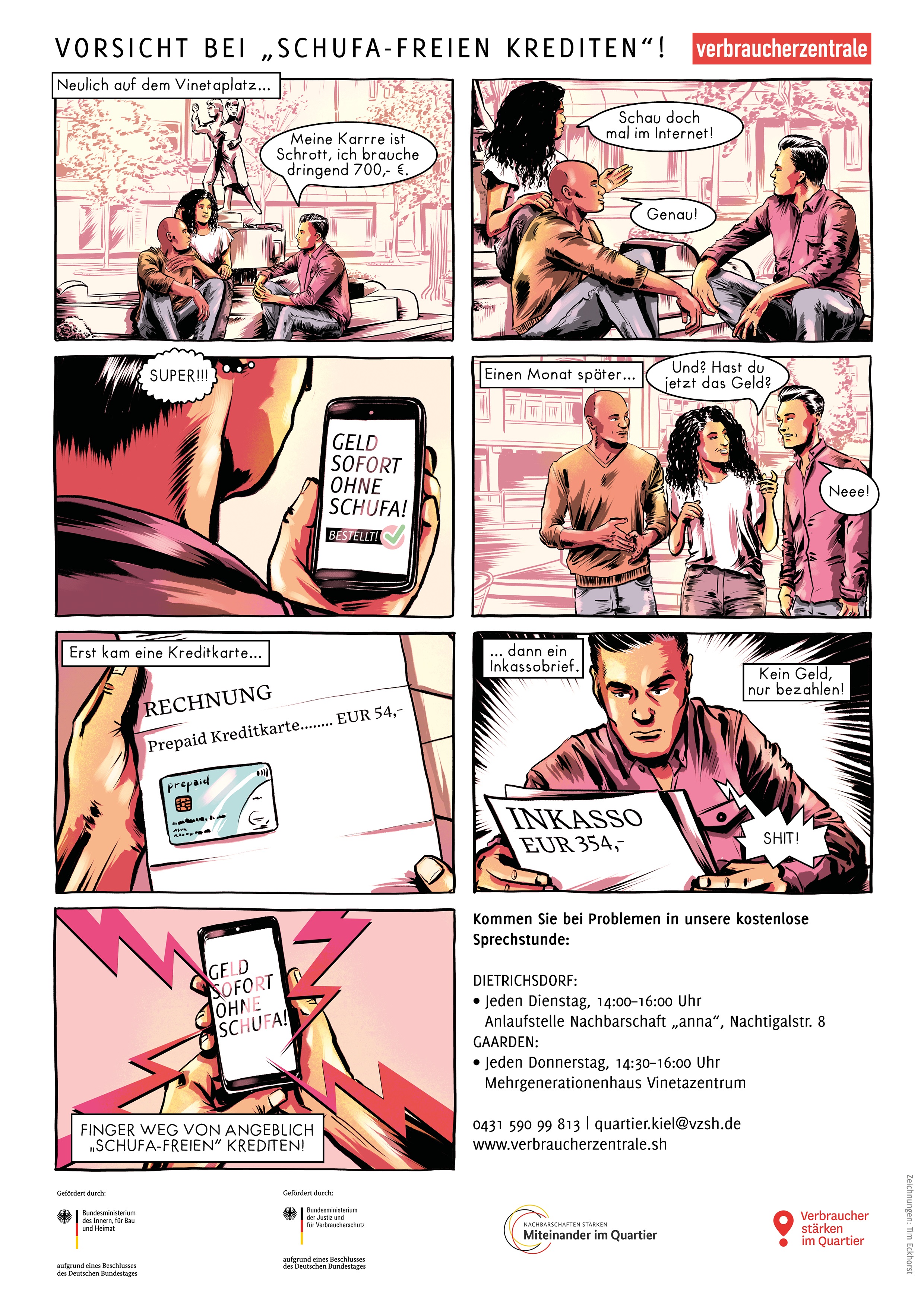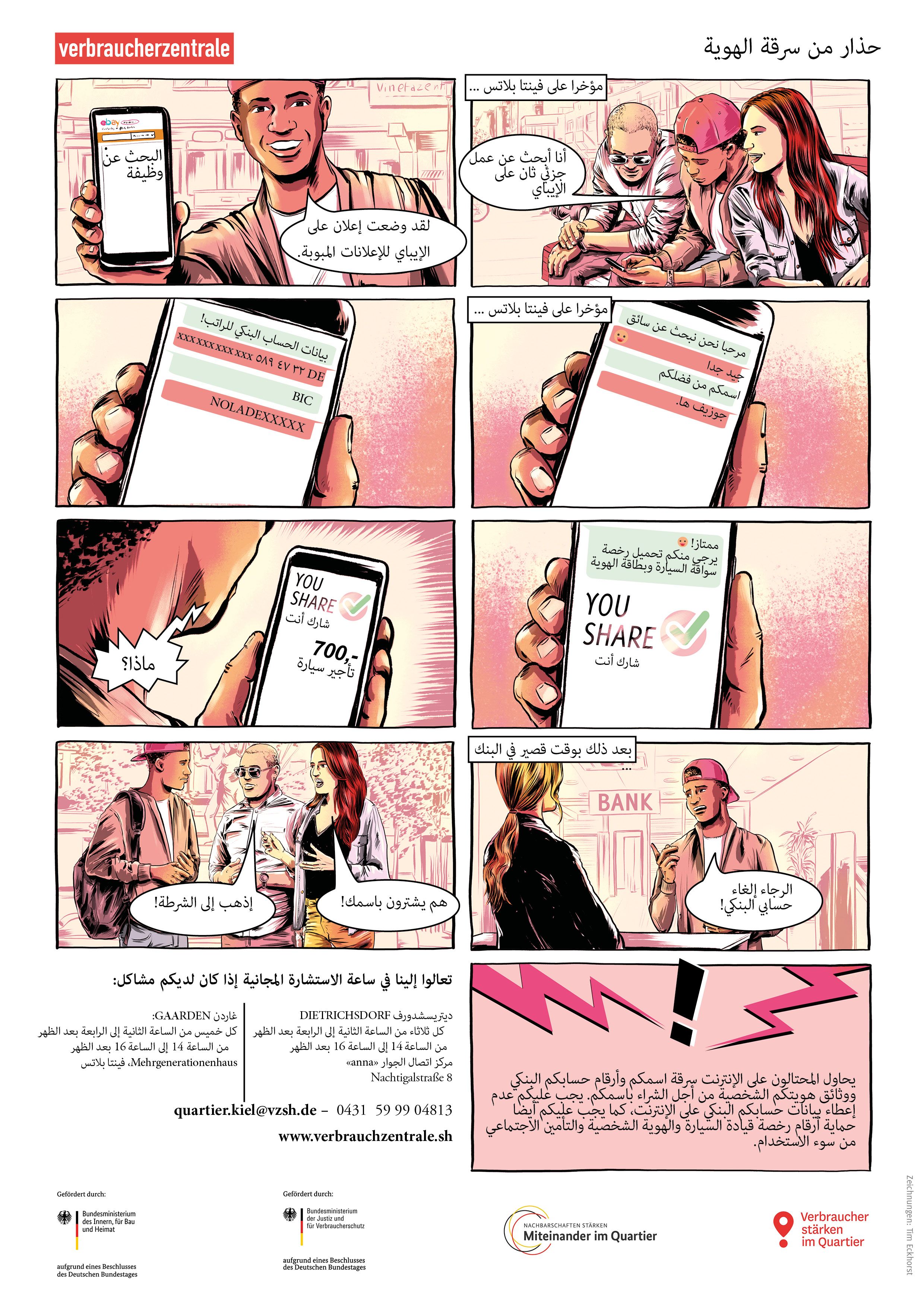 Hier gibt es die Comics "schufafreie Kredite" , "Kündigungsfristen bei Handyverträgen" und "Datendiebstahl bei der Jobsuche" in arabischer Übersetzung.